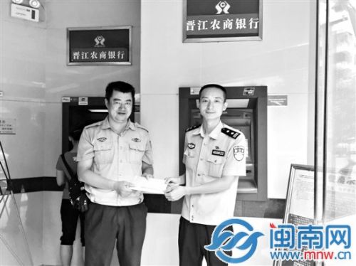 闽南网8月26日讯 “人家辛辛苦苦存点钱,骗子却想轻松骗走,这可不行!”昨天上午,晋江金井派出所民警到晋江农商银行金井支行,表彰多次成功拦截诈骗汇款的银行保安张育琛,送上奖励金500元。