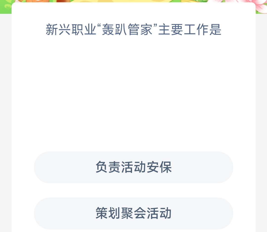 轰趴管家主要工作是负责活动安保还是策划聚会活动?这是蚂蚁新村2月18日的问题。答对即可获得3个村民作为奖励,那么接下来就让我们一起了解一下蚂蚁新村2月18日的答案吧。
