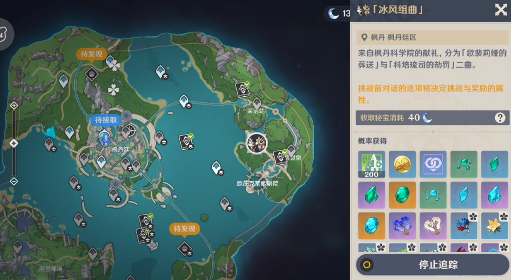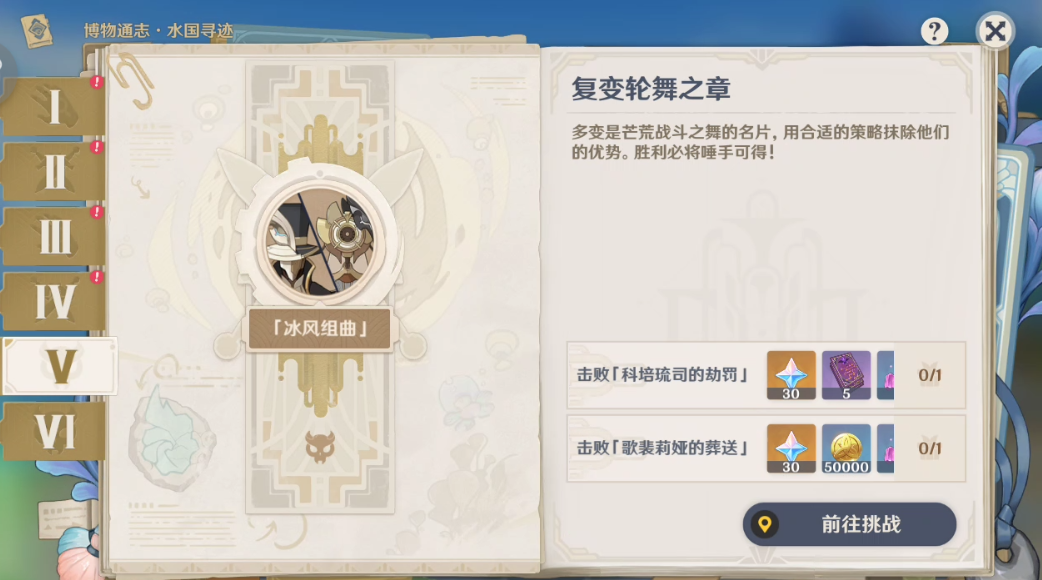 第五章为复变轮舞之章,玩家需要分别击败冰风组曲两次,最终能够获得60原石和若干摩拉经验书和武器素材等奖励。