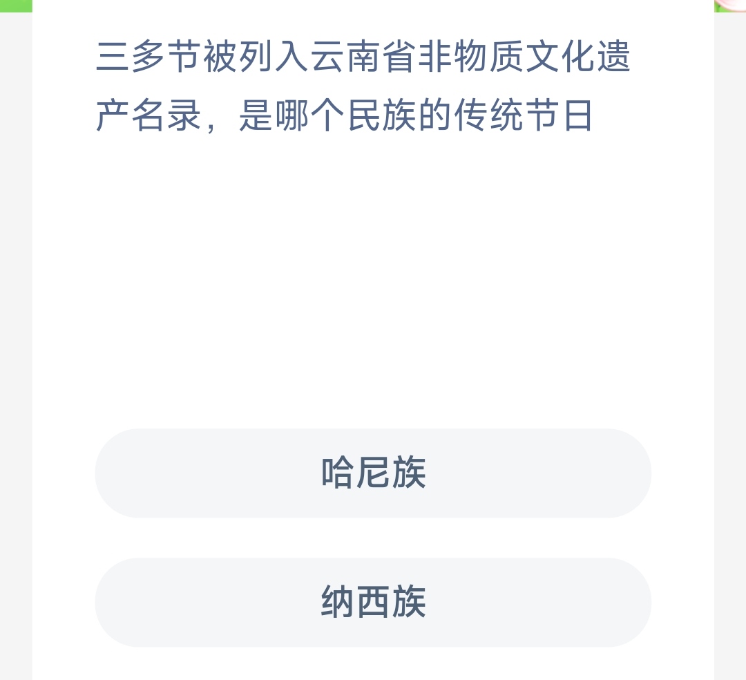 三多节被列入云南省非物质文化遗产名录是哪个民族的传统节日?这是蚂蚁新村6月11日的问题,下面一起来看看6月11日蚂蚁新村三多节被列入云南省非物质文化遗产名录是哪个民族的传统节日的答案吧。