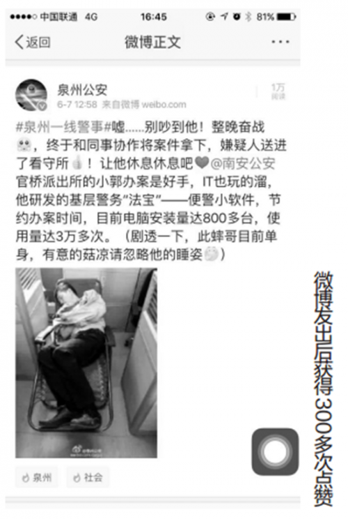 “当时就睡了十几分钟,图片是我同事拍的,反响这么大有点出乎意料。” 近日,记者找到这名新晋“网红”——南安官桥派出所民警郭志勇,谈起走红经历,这位阳光大男孩笑了。据介绍,原本只是分享到所里的工作群,权当同事间的玩笑,没想到他这样睡姿“妖娆”地火了。