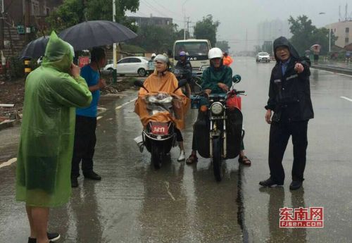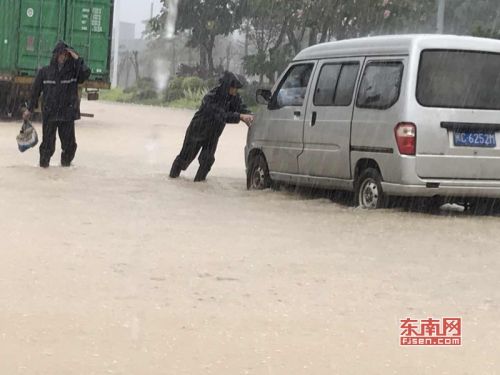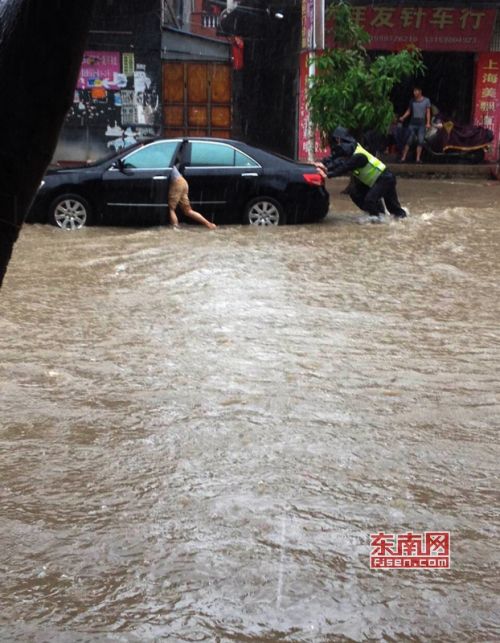 南安市洪濑镇东大路建行路口、洪梅路口严重积水,洪濑派出所全所民警总动员上路巡查和疏导交通,帮助群众推车,摆放警示牌实行交通分流。