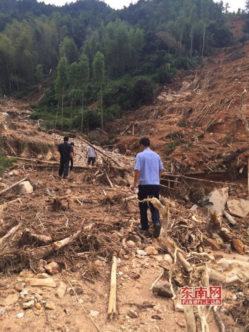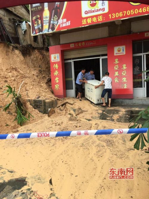 南安市眉山镇山路塌方,眉山派出所民警、协勤正在抢险救援。
