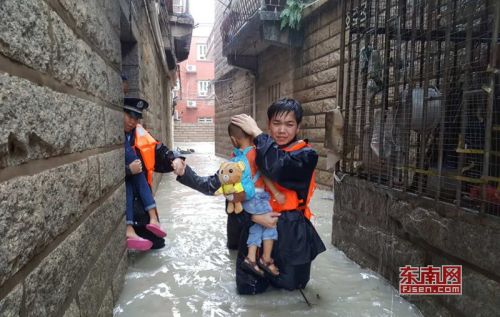 孩子别怕,叔叔来救你。这是台风灾害中最美的身影。水头巷内村一民房内被困四人,两名大人两名小孩,水头派出所民警及时将他们转移到安全地带。这是当时民警抱出小孩的场景。