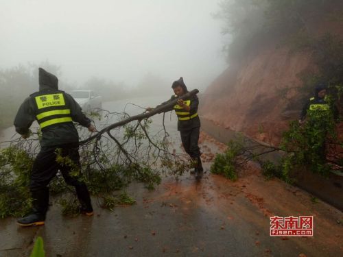 驻守在九都镇林坑村的南安特警与九都所民警连续奋战20多个小时,不休不眠做好“莫兰蒂”灾后二次回流群众的疏散转移、加固抢险等工作。图为特警队员与民警在帮助转移群众。