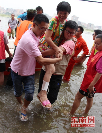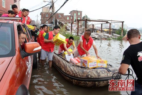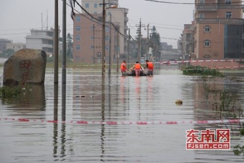 29日下午,东南网记者到达水头镇上林村时,只见整条村道及农田完全被水淹没了,积水莫过膝盖,前方正有冲锋舟和橡皮艇不断的往外输送被困群众。而在村道边一居民房前,正有来自各方面的救援人员,准备轮番进村救援。