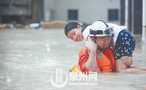 “我女儿一个人在家,她打电话说在家害怕,肚子饿。”上午11时许,家住2号楼的吴先生向水头消防中队求救。接到警情后,消防人员让吴先生给她女儿打电话,走到一楼积水前等待救援。此前,积水齐胸,且水流较急。几名消防人员身上绑着绳子,每隔约半米站一个,这样一直排到楼梯口,由最前排的消防官兵把小朋友扛在肩上转移出来。