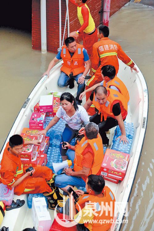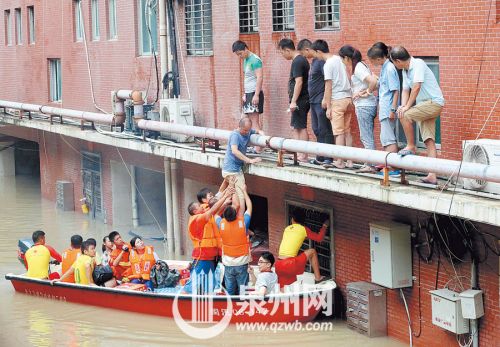 受台风“鲇鱼”影响,昨日南安市普降大雨,水头镇区受灾严重,其中水头镇区鸿星小区因地势较低,四幢楼的居民被困至少6小时,各方救援人员正在这里紧张转移人员,并为楼内居民送食物等物资。