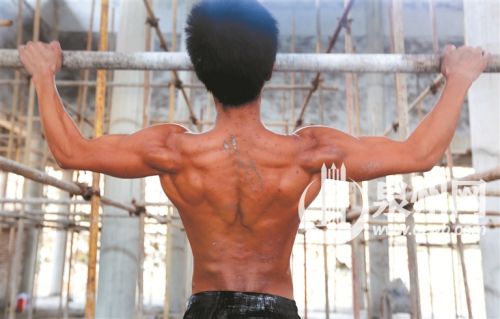 石神伟来自湖北大冶龙角山村,今年22岁,皮肤黝黑,身高1.68米,体重约55公斤,乍看有些瘦,但当他一用力,全身上下鼓起来的都是肌肉。在脚手架下运送水泥的时候,他顺手借用车臂做了个“俄式挺身”。
