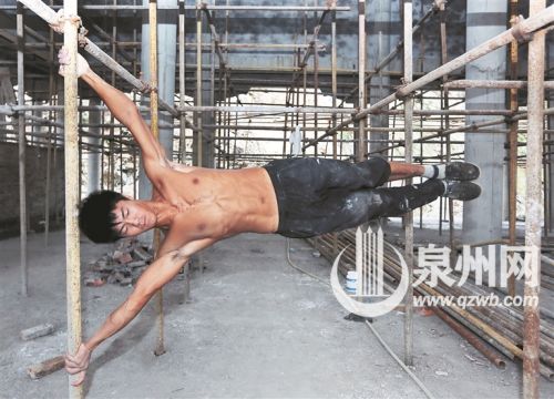 慢慢地,从顺风旗、俄式挺身、龙旗……脚手架是现成的单杠、双杠,日复一日的训练,他学会了越来越多的动作。没有专人指导,没有安全防护,训练中也受了许多伤。