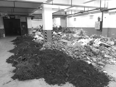 地下停车场堆满建筑垃圾。