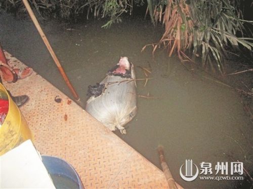 到了现场,民警借船到达河中央,只见麻袋鼓鼓的,民警费了好大力气才将麻袋搬上船。等到上岸打开一看,原来是虚惊一场——里面装的全是死猪。
