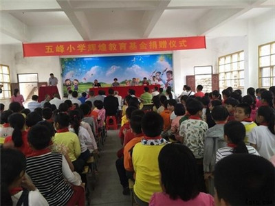 10月18日,官桥镇黄山村乡贤黄辉煌先生捐资50万元人民币支持五峰小学奖教助学,当天下午,五峰小学隆重举行“辉煌教育基金”捐赠仪式。官桥镇人大主席潘瑞意、镇党委副书记陈雅丽,黄山村贤达黄辉煌,中心小学校长陈建山,黄山村两委,老人会、校董会负责人及五峰小学全体师生等参加捐赠仪式。