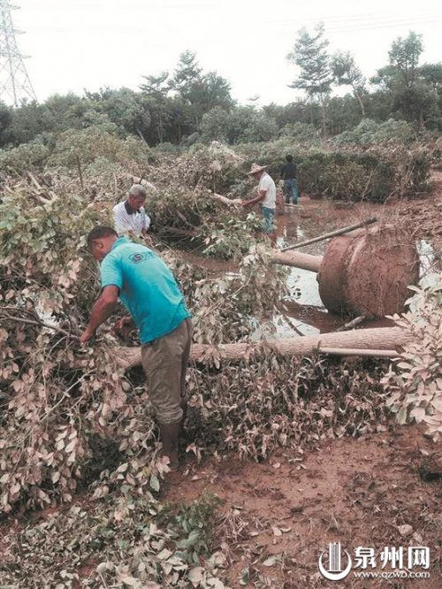 据介绍,金霞园林有10多个基地,占地面积约2000亩,种有乔木、棕榈、灌木等几种品类。金霞园林基地董事长郑志平告诉记者,台风“莫兰蒂”给基地带来巨大的损失,7个基地被水淹,3万株苗木被吹倒、吹断,基根路被冲垮,灌溉设备和工程机械泡水里,洪水甚至淹到办公楼。“山上一个景区正在修建中,台风使得之前的工作全部白费”,步道和挡土墙被冲毁,搭建人工瀑布的架子倒塌,鱼塘里的鱼苗被泥沙冲走。