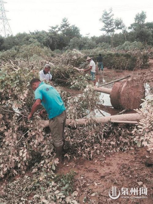 据介绍,金霞园林有10多个基地,占地面积约2000亩,种有乔木、棕榈、灌木等几种品类。金霞园林基地董事长郑志平告诉记者,台风“莫兰蒂”给基地带来巨大的损失,7个基地被水淹,3万株苗木被吹倒、吹断,基根路被冲垮,灌溉设备和工程机械泡水里,洪水甚至淹到办公楼。“山上一个景区正在修建中,台风使得之前的工作全部白费”,步道和挡土墙被冲毁,搭建人工瀑布的架子倒塌,鱼塘里的鱼苗被泥沙冲走。