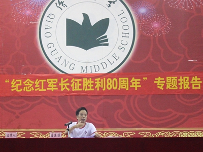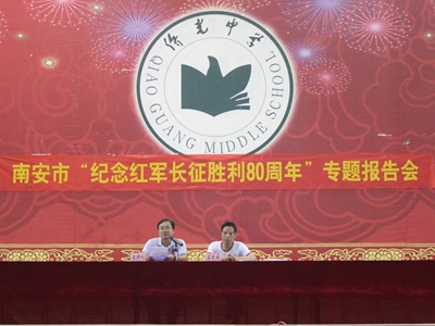 此次报告会由金淘镇党委副书记林泽朴同志主持,邀请了南安市新四军研究会副会长兼秘书长吕连祺同志作报告。报告会上,吕连祺同志带领同学们一起追忆了“红二支队”在南安的革命斗争史以及发生在南安大地上的的抗日救亡运动,缅怀了革命先烈的丰功伟绩,颂扬了他们的革命精神,博得了同学们的阵阵掌声。侨光中学潘敬铭副校长在会上要求同学们要铭记“长征永远在路上”,要学习弘扬长征精神,坚定信念,自强不息,锐意进取,艰苦奋斗,勇攀知识的高峰,为实现中华民族伟大复兴的“中国梦”而努力奋斗!