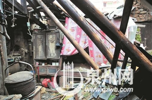 第二天起床后,她将水桶里的雨水倒入古厝排水沟里,随后出门。上午10点,回到家中的她发现,房间里土墙的土层不断剥落,墙面和屋顶的杉木横梁发出“咯吱”的声音。“阿得,阿得,快过来。房子可能要塌了”。听到母亲的呼喊声,欧阳得从自己的房间冲了出来,发现大事不妙,让母亲待在门外不要乱动,自己一个箭步冲进母亲房内,一把拿起刚买回来的新锅。突然“轰隆”一声,半个房顶瞬间塌了下来,床和桌子几乎被埋进废墟。幸运的是,欧阳得没被砸到,但依然被房塌扬起的粉尘弄得灰头土脸,赶紧撤出房间。