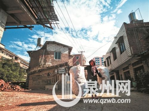 挑着比自己身子还要大的编织袋,阿婆慢悠悠地走向镇区的废品回收站。 (洪宗洲 摄)