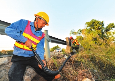 昨日,记者在泉三高速省新出口连接线看到,路边每隔一段就放了一杆路灯架,多名工人正分工协作,埋设电线(上图)。
