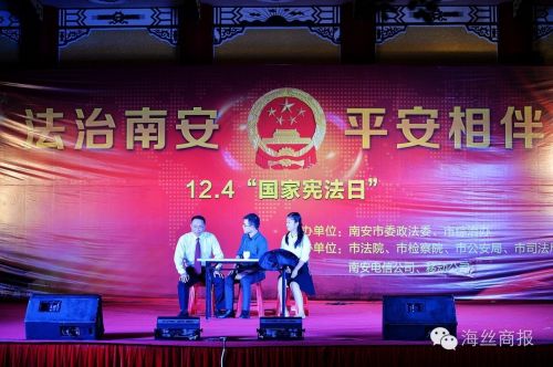 南安市“国家宪法日”法治文化广场宣传系列活动是今年“12·4”活动的重头戏,也是全市“七五”普法规划一项重要举措。“国家宪法日”法治文化广场宣传系列活动分为两块,一部分是法治文化联展,政法系统各单位通过发放宣传资料、义务法律咨询、法治展览、法治谜语竞猜等丰富多彩的形式,向市民们宣传与他们生产生活息息相关的法律法规;另一部分为当晚的文艺会演,平时严谨严肃的政法系统干部职工登上舞台,载歌载舞,用市民喜闻乐见的艺术形式宣传宪法等法律知识。