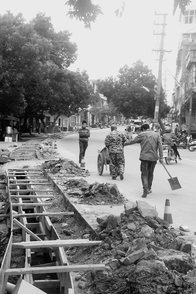 昨日,记者在现场看到,几名工人正在路边安装路沿石,污水沟已完成清淤,并钉上木板等待浇筑(上图)。