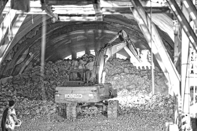 当日,爆破声息后,几辆推土机和挖掘机驶入隧道,打算将渣土运出。记者深入隧道发现,几名工人正忙着铲土、运渣。不久后,一辆挖掘机朝前一挖,洞内顿时光亮一片。“通了!通了!”工人们止不住雀跃心情,纷纷拿起手机拍照留念。