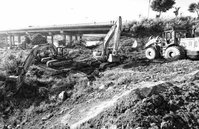 在晋江防洪工程南安霞东段,挖掘机正在平整土地。