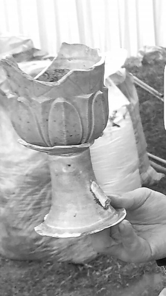 遗址现场散落的瓷器碎片和发掘出的宝莲灯。