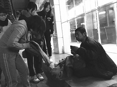 在寒冷的街头,巫东平蜷缩着身子躺在地上,市救助管理站站长李惠琼赶紧将毛被和棉衣盖在他的身上,工作人员给他送上泡面、面包等。