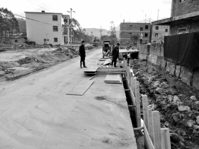 昨日,记者在潭溪村五板桥看到,1公里长的排洪渠已全线清淤,边上的道路路基、岸边大部分已完工,工人正在安装水泥模板,对排洪渠岸边进行硬化施工(右上图)。