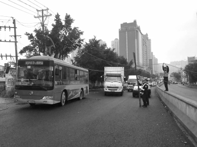 交警的行为很快得到过往司机的认可,一个公交车司机还主动爬到车顶,配合他们撑开电线。
