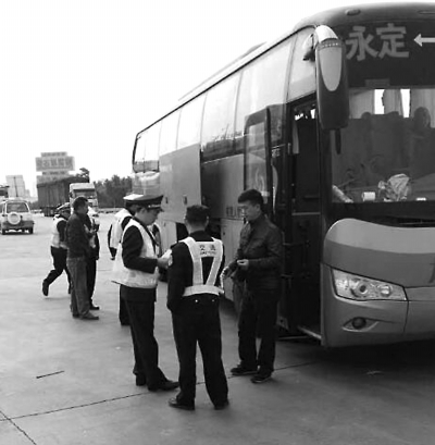 水头西高速入口外,春运安全监督服务岗的执法人员正在对一辆客车进行检查。
