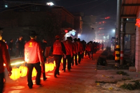 据了解,作为全国九大灯会之一的英都拔拔灯,在每年的正月初九最为隆重盛大。记者获悉,每到游灯会即将开始前,村民都会事先备好特制的数条粗大的长缆大麻绳,再由各家各户自己带来各式灯笼,挂在大绳上,每条可悬挂数十盏甚至一百多盏,如此称为“一阵”。数条连成数阵,再选择一名体形剽悍的男子为首,前头打起两把大火把,并排行进为主导,组成12支拔拔灯队伍。