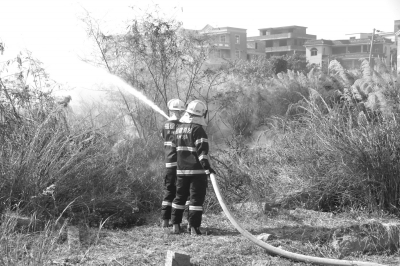 14日,消防人员在美林万家美针织厂附近的草地灭火。(见习记者 叶凯茹 通讯员 林媛 黄德鑫 文/图)