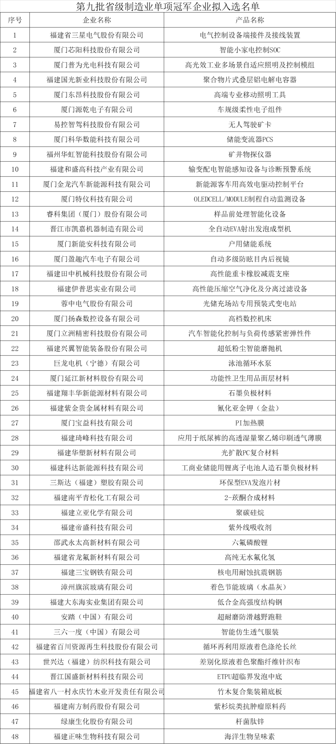 根据《关于印发制造业单项冠军企业管理实施细则的通知》(闽工信规〔2024〕2号)和《关于开展2025年省级制造业单项冠军申报和日常管理工作的通知》(闽工信函产业〔2025〕146号),经研究,现将第九批省级制造业单项冠军企业拟入选名单予以公示,公示期为公示之日起5个工作日。如有异议,请在公示期内向球探体育比分:工业和信息化厅反馈。