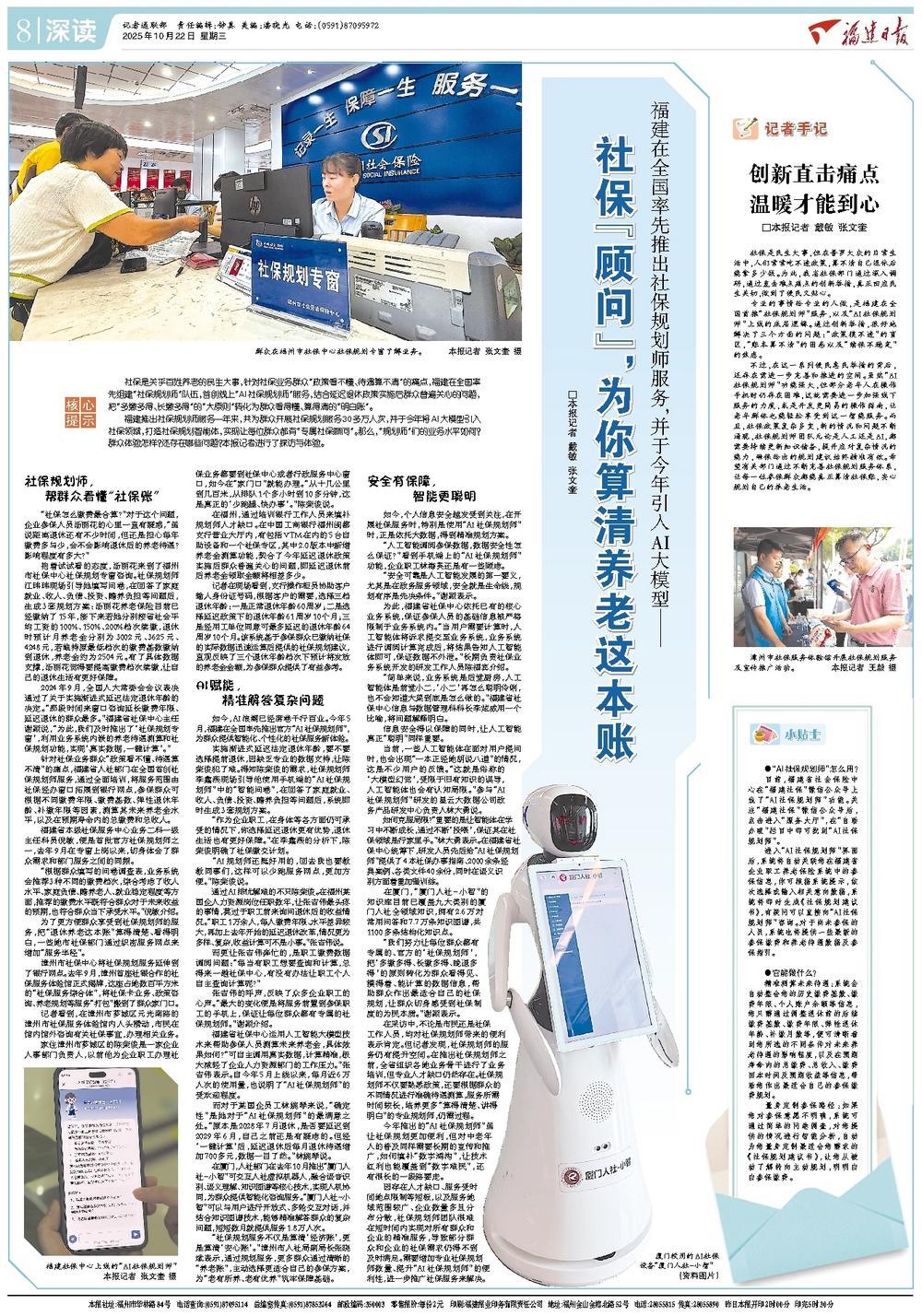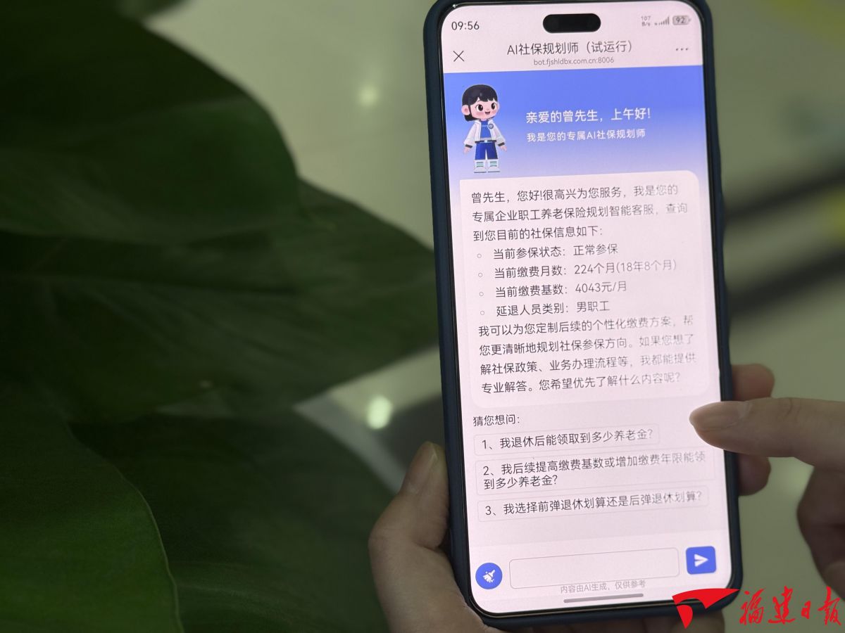 社保是关乎百姓养老的民生大事,针对社保业务群众“政策看不懂、待遇算不清”的痛点,福建在全国率先组建“社保规划师”队伍,首创线上“AI社保规划师”服务,结合延迟退休政策实施后群众普遍关心的问题,把“多缴多得、长缴多得”的“大原则”转化为群众看得懂、算得清的“明白账”。