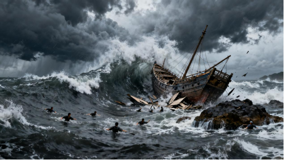 琉球接贡船在平潭钟门村附近海域触礁遇难。(AI制图)