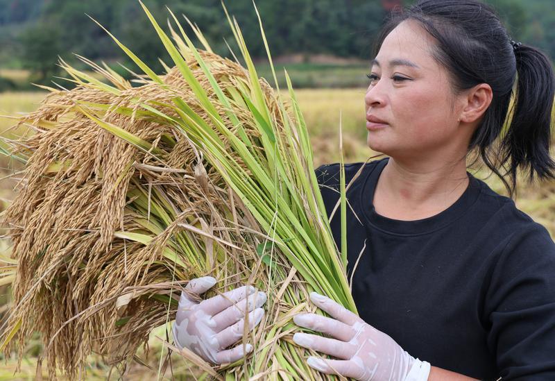 日前,武夷山市崇安街道来福农场员工展示丰收的优质稻。邱汝泉 摄