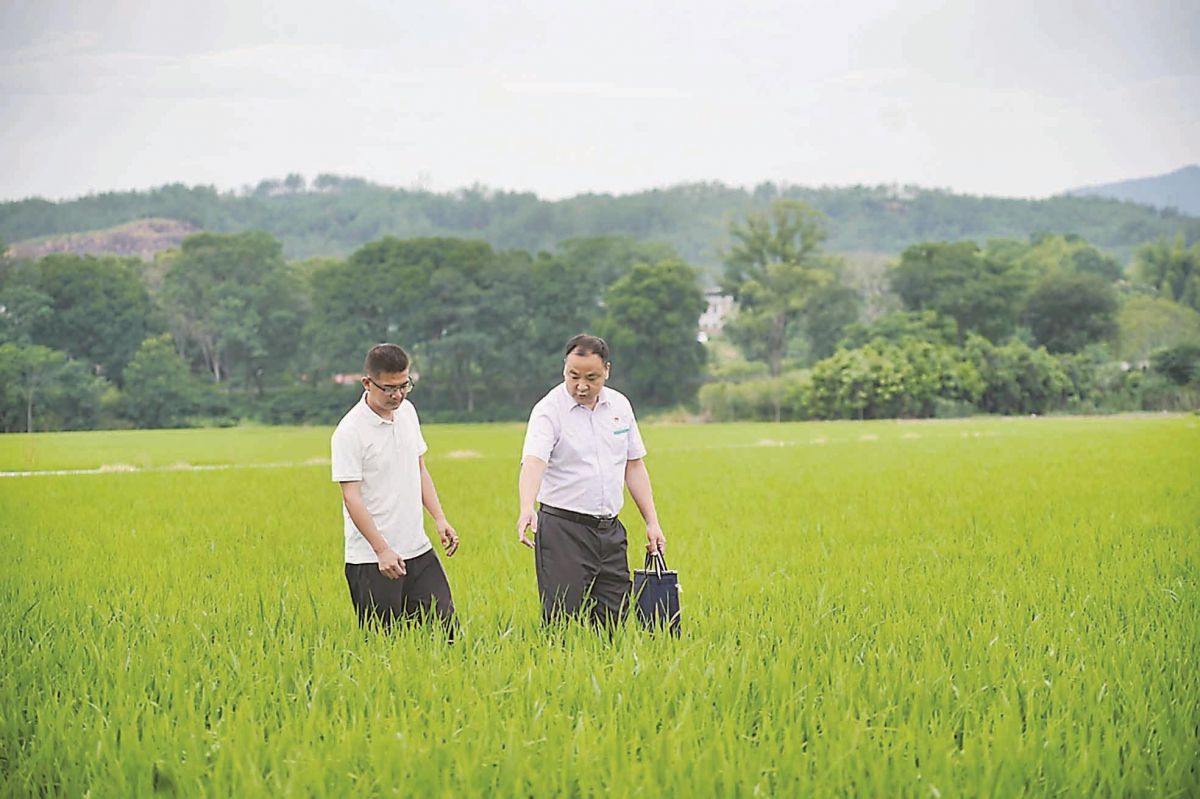 农业银行工作人员在长汀县河田镇万亩现代农业产业园了解水稻生长情况。