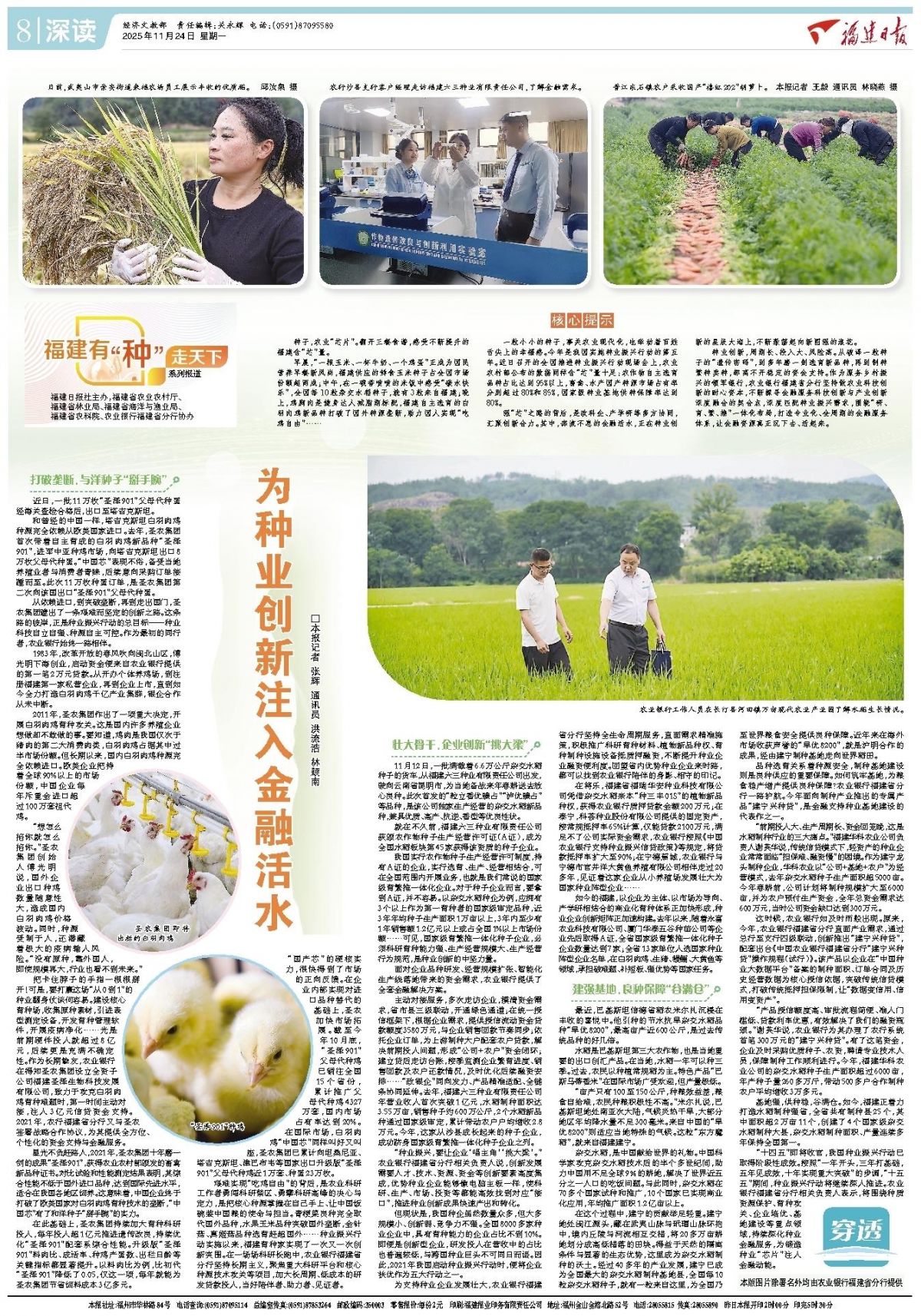 主动对接服务,多次走访企业,摸清资金需求,省市县三级联动,开通绿色通道;在统一授信框架下,根据企业需求,提供授信流动资金贷款额度3580万元,与企业销售回款节奏同步;依托企业订单,为上游制种大户配套农户贷款,解决前期投入问题,形成“公司+农户”资金闭环;建立贷后走访台账,按季监测企业繁育进度、销售回款及农户还款情况,及时优化后续融资安排……“政银企”同向发力、产品精准适配、全链条协同延伸。去年,福建六三种业有限责任公司年营业收入首次突破1亿元,水稻制种面积达3.55万亩,销售种子约600万公斤,2个水稻新品种通过国家级审定,累计带动农户户均增收2.8万元。今年,这家从沙县成长起来的种子企业,成功跻身国家级育繁推一体化种子企业之列。