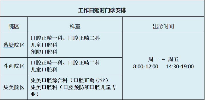 蔡塘、斗西、集美三院区同步发力,口腔正畸科、儿童口腔科、预防口腔科三个科室先行试点,工作日门诊结束时间从17:30延长至19:00。