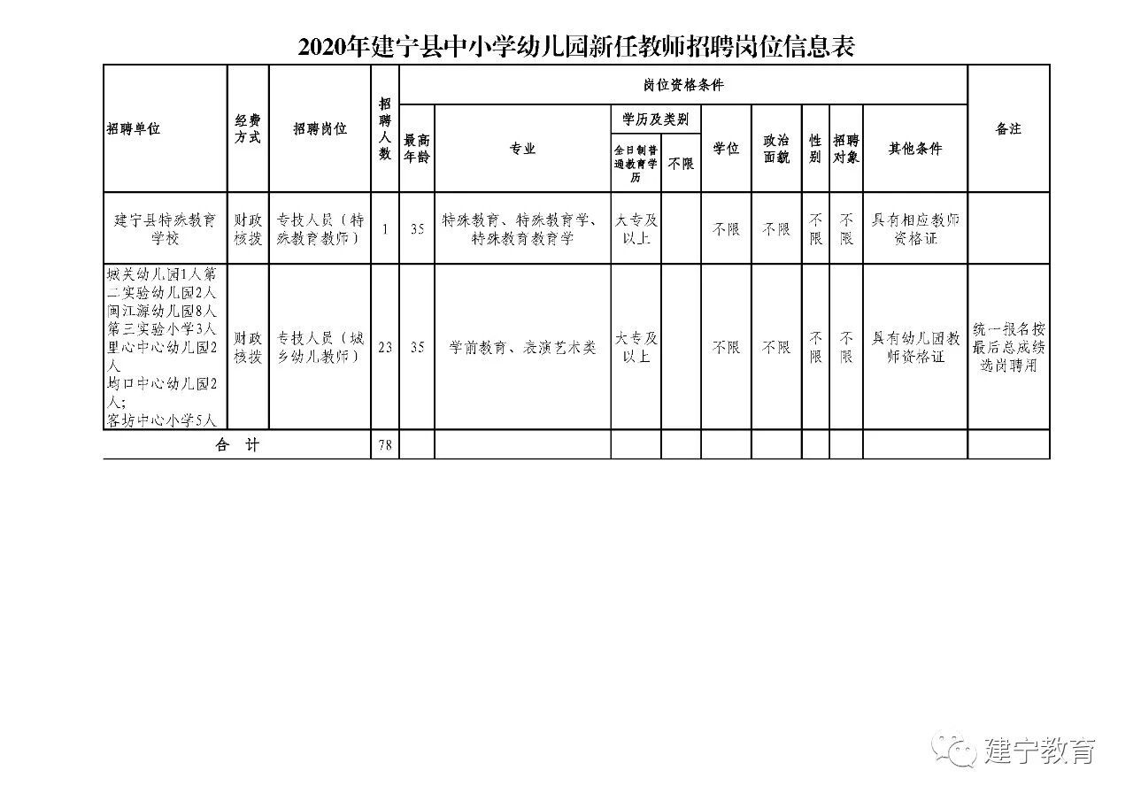 2020年我县计划公开招聘中小学幼儿园教师78人。通过全省统一考试的具体招聘学校、招聘岗位、招聘人数详见《建宁县2020年中小学、幼儿园公开招聘新任教师岗位信息表》(新聘用的城区学校教师应根据需要到乡镇中小学、幼儿园交流支教二年以上)。