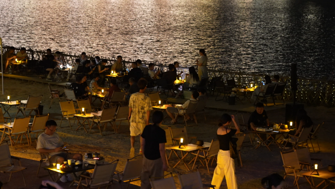 虽然场地的上方是川流不息的水仙花大桥,但这片桥下空间却让人感到格外的宁静。除了建设篮球和乒乓球等综合运动场地,在靠近江边的亲水地段还结合周边环境,增设了沙滩、木栈道和露营平台等设施,引入茶座、咖啡等消费业态,打造出一个“青春不散场”的主题广场。曾经荒草丛生的“闲置地带”,如今已变身成为充满诗意与生机的“城市客厅”,市民或休闲饮茶、或打卡拍照,一片温馨惬意。