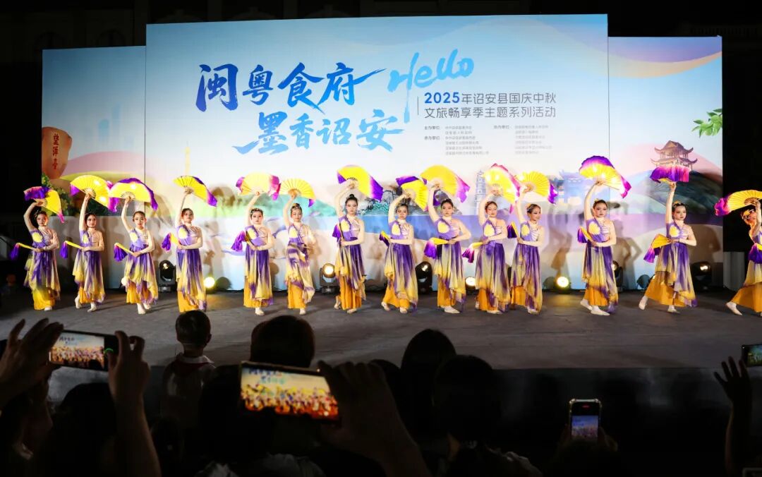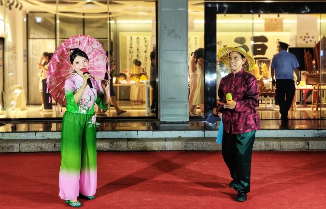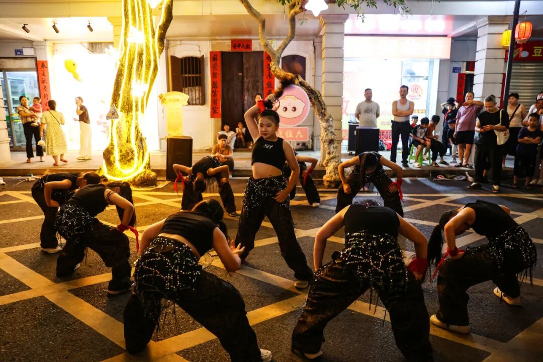 非遗集市氛围正浓时,“华灯初上”舞台演出接档登场。广场灯光骤然亮起,青少年街舞的动感节拍叩击地面,骑楼廊道里的回声都跟着跳跃;闽南传统乐器演奏响起,传统乐器的醇厚音色缠绕着骑楼立柱漫开,与远处隐约的市井声交织成韵;国风舞蹈演员的水袖掠过舞台,恰似诏安书画中的写意笔触,将传统与现代的交融演绎得淋漓尽致。