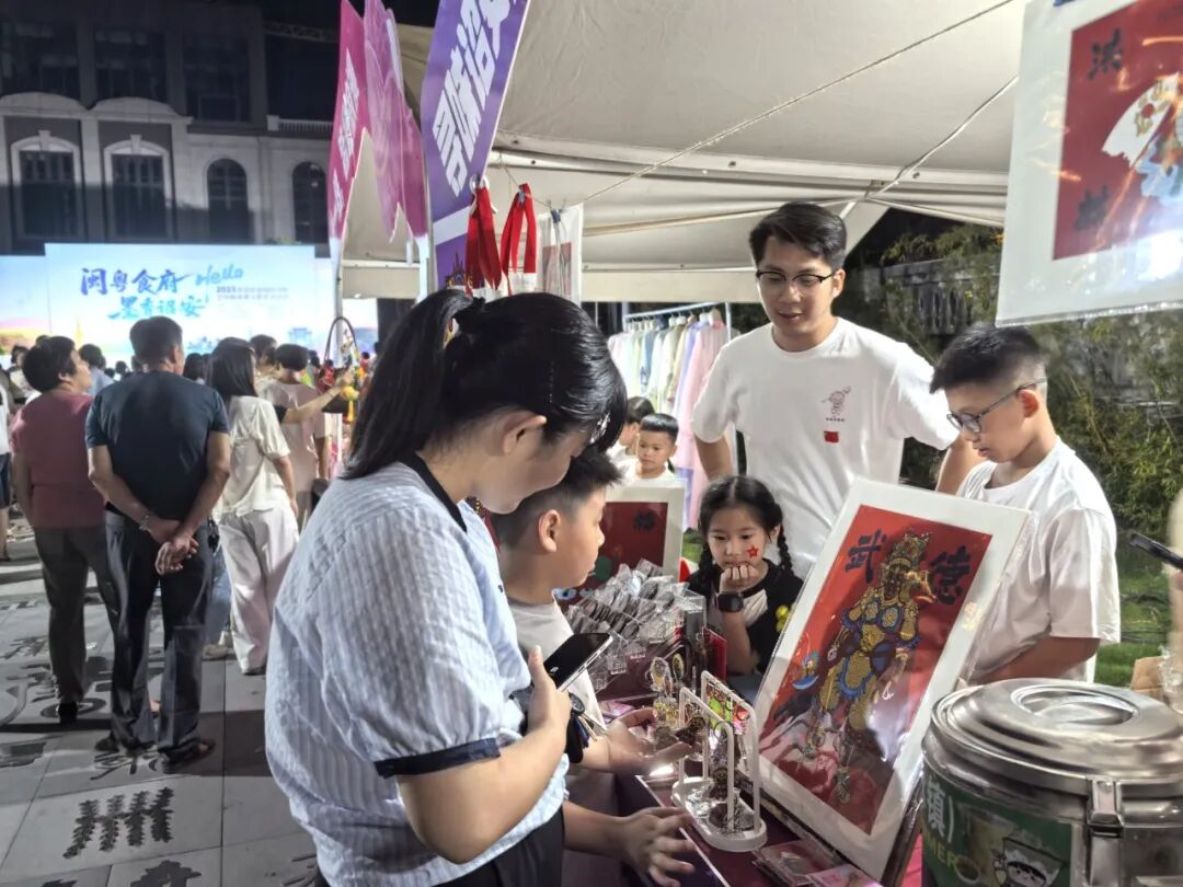 活动伊始,“非遗雅集”文化集市的多个展示点位前很快聚起人群——彩扎摊位上,竹篾作骨、绸缎为衣的戏剧头冠流光溢彩,金丝银线在指尖翻飞间凝结成精巧造型;传承人正手把手教大家剪纸,让传统技艺的温度在指尖传递。文创市集的红灯笼映着各式展品,从融合诏安民俗的钥匙扣、麒麟狮手办、非遗剪瓷雕到手工编织、墨香书签,每样物件都藏着诏安的匠心与韵味。