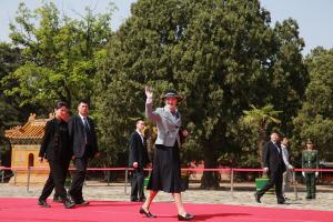 5. 丹麦女王玛格丽特二世参观北京十三陵险在棱恩殿北门处滑倒