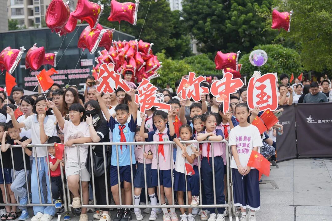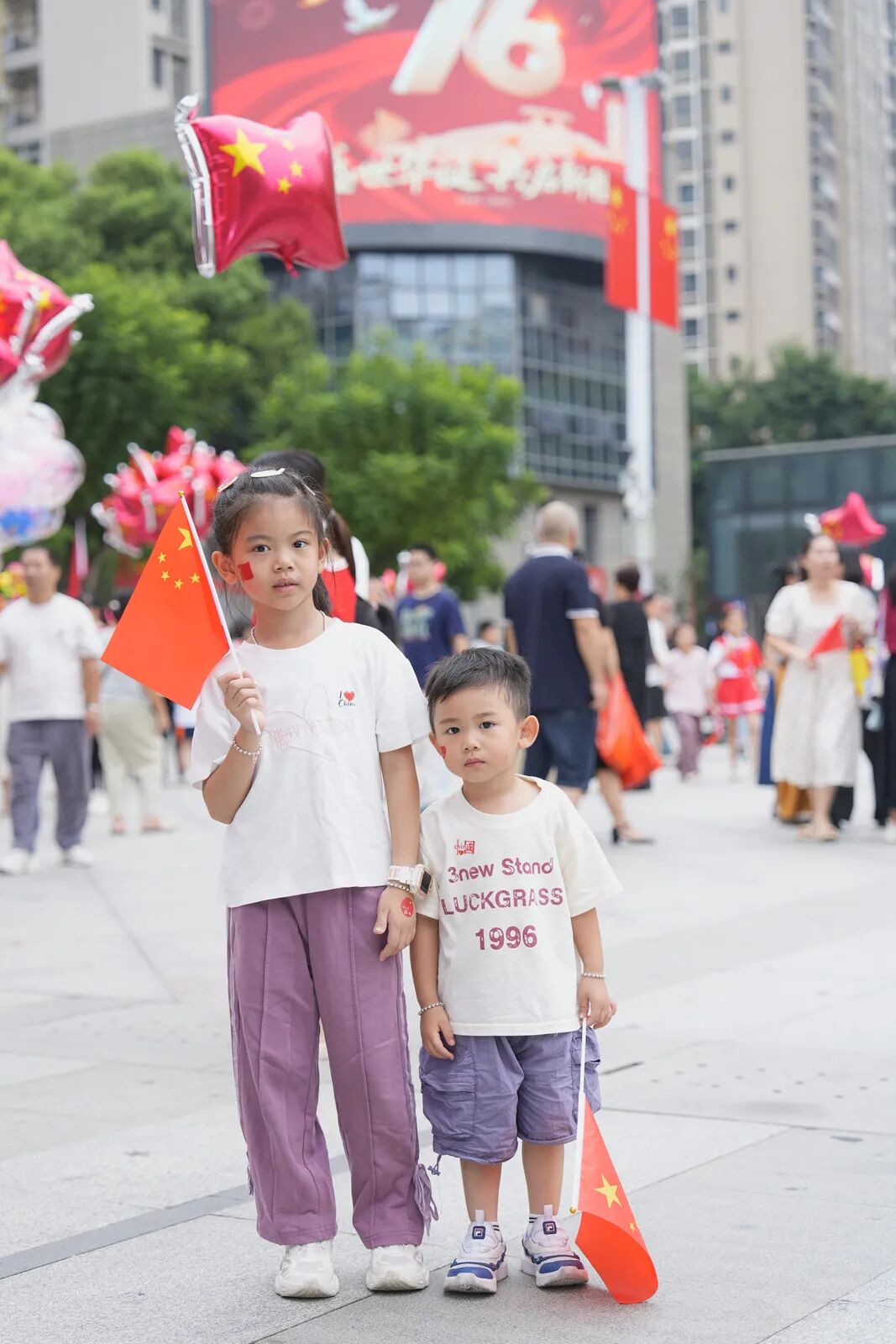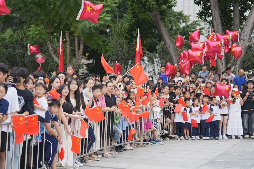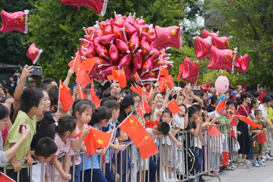 不少群众手持国旗、气球,