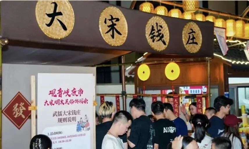 夜市入口处,一座古朴的“大宋钱庄”格外引人注目。这不仅是兑换“交子”的场所,更是游客开启宋“潮”之旅的第一站。据主办方介绍,这种古代最早的纸币在此被赋予新的生命力,10贯交子等值于10元人民币,可在夜市内大部分商家消费。