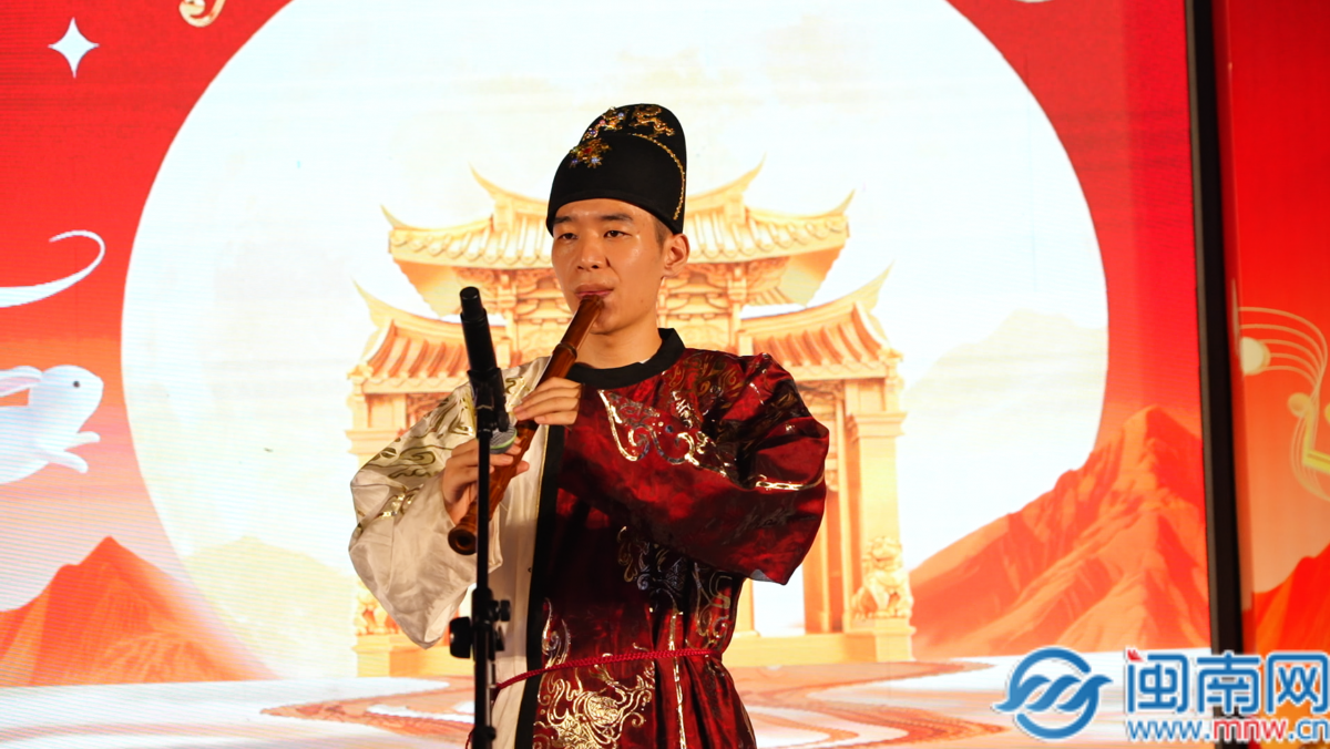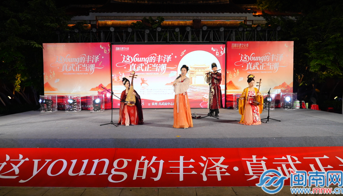 今晚7时30分许,在真武庙广场,来自南音新唱特乐队的演员们穿着古装,手抱琵琶和二胡,弹奏出一曲曲非遗南音。在观众们的期待中,乐队演唱了《刀马旦》《桃花笑》《青花瓷》等曲目。当南音古老的工尺谱、缠绵的唱腔,遇上电子音乐和流行音乐的律动,便会营造出一种“穿越时空”的听觉体验。