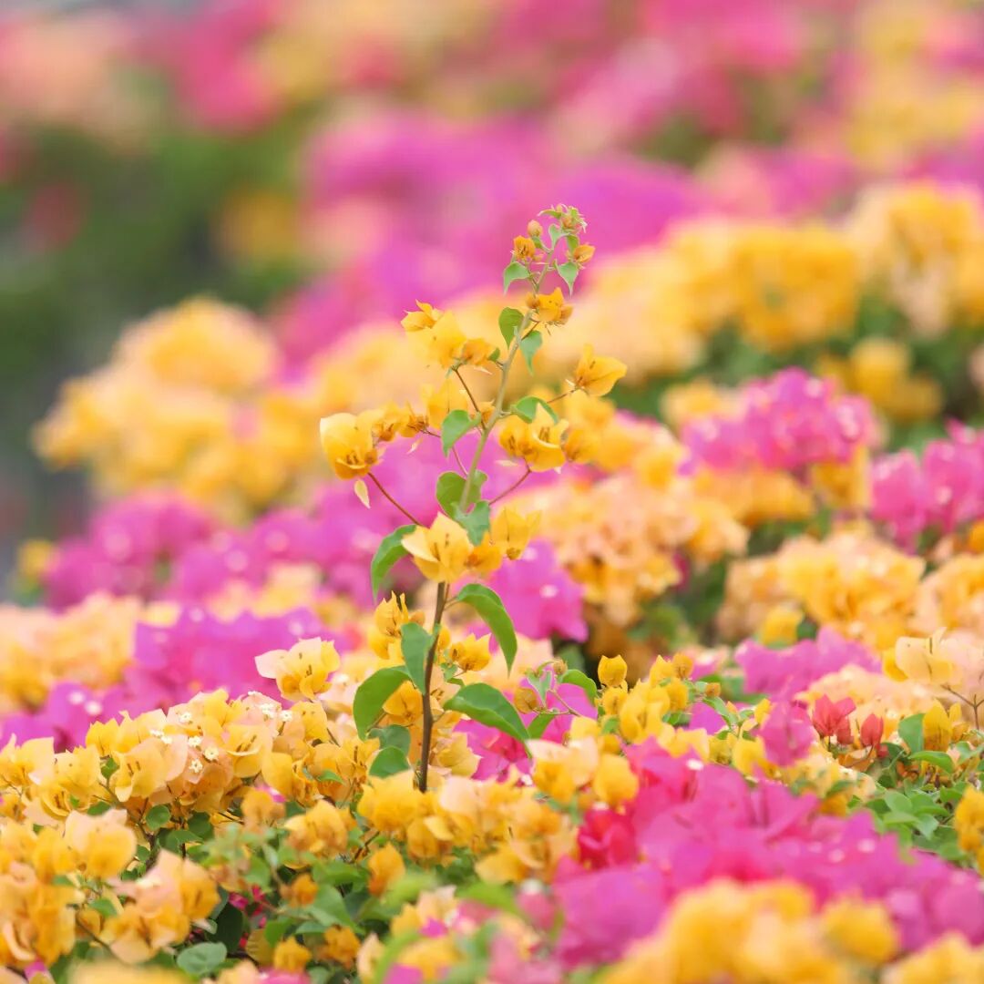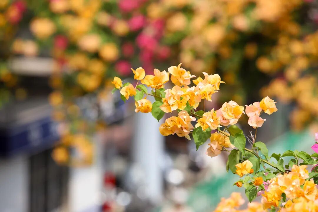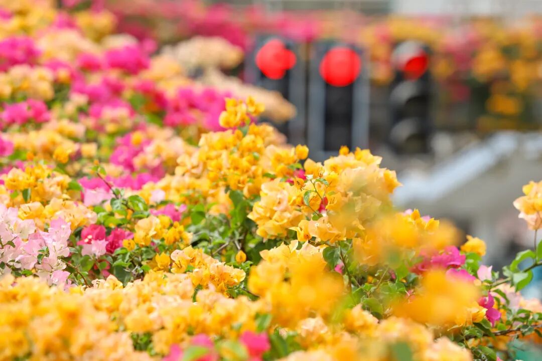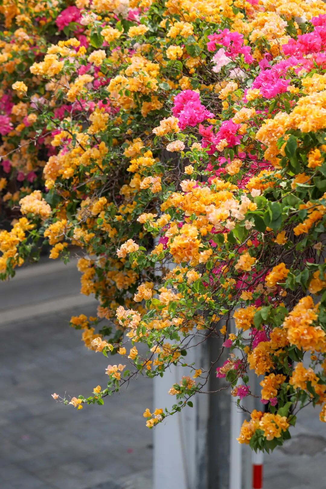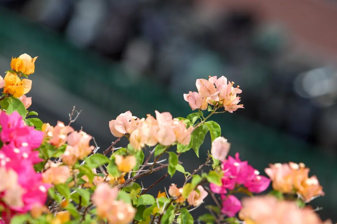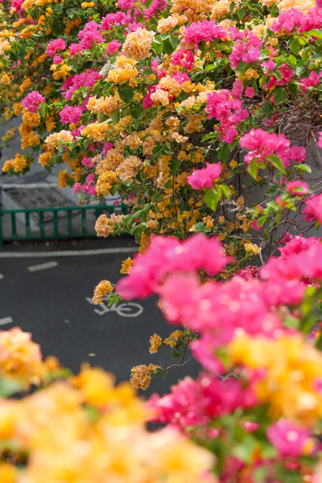 嫣红、粉紫、橙黄的花瓣层层叠叠